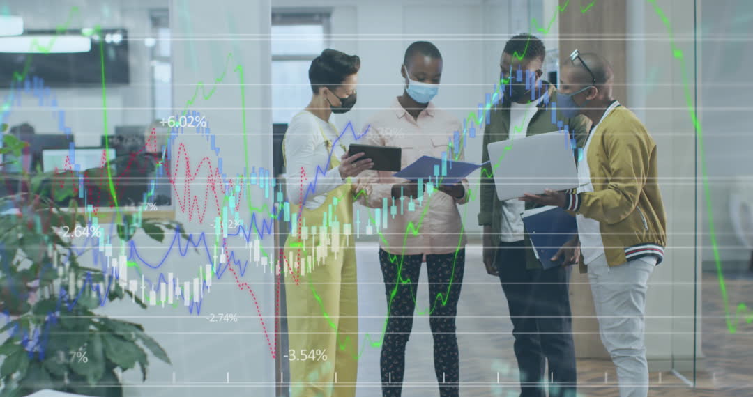 Group of diverse business professionals wearing face masks discussing reports and data, with digital financial graphs superimposed. Useful for articles or presentations on business strategies during a pandemic, financial analysis, or the impact of COVID-19 on workplaces.