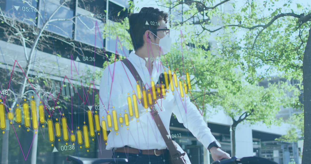 A masked man, immersed in a city environment, is holding a cellphone while seated on a bicycle. The transparent overlay of dynamic graphs and numbers suggests a blend of real-world transportation and digital data analysis. Suitable for use in projects related to business growth, technology integration in everyday life, urban transportation, or health safety awareness.