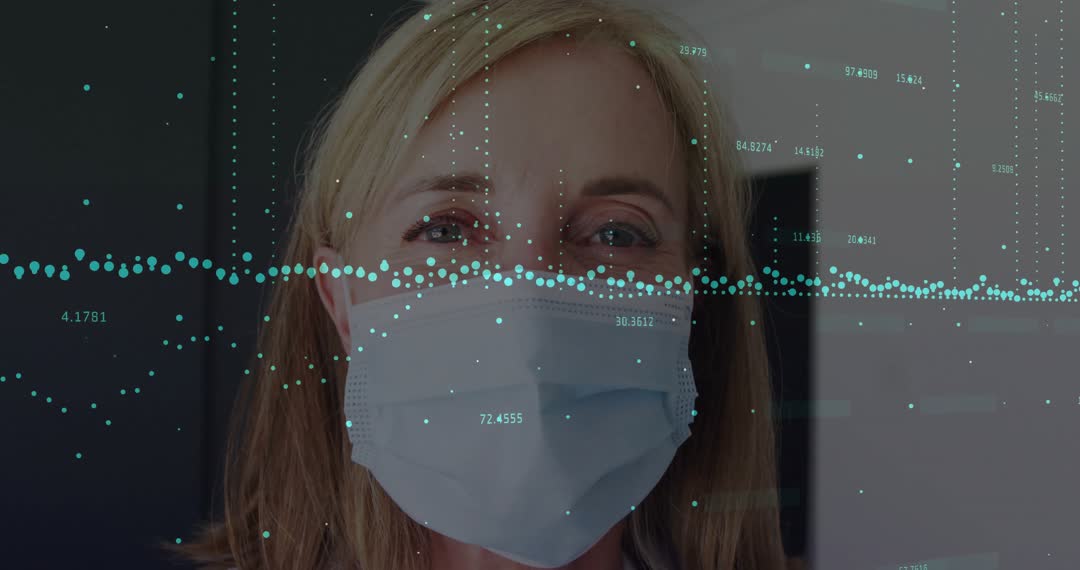 Masked Woman with Data Overlaying Face Depiction of Analytics in Education Video