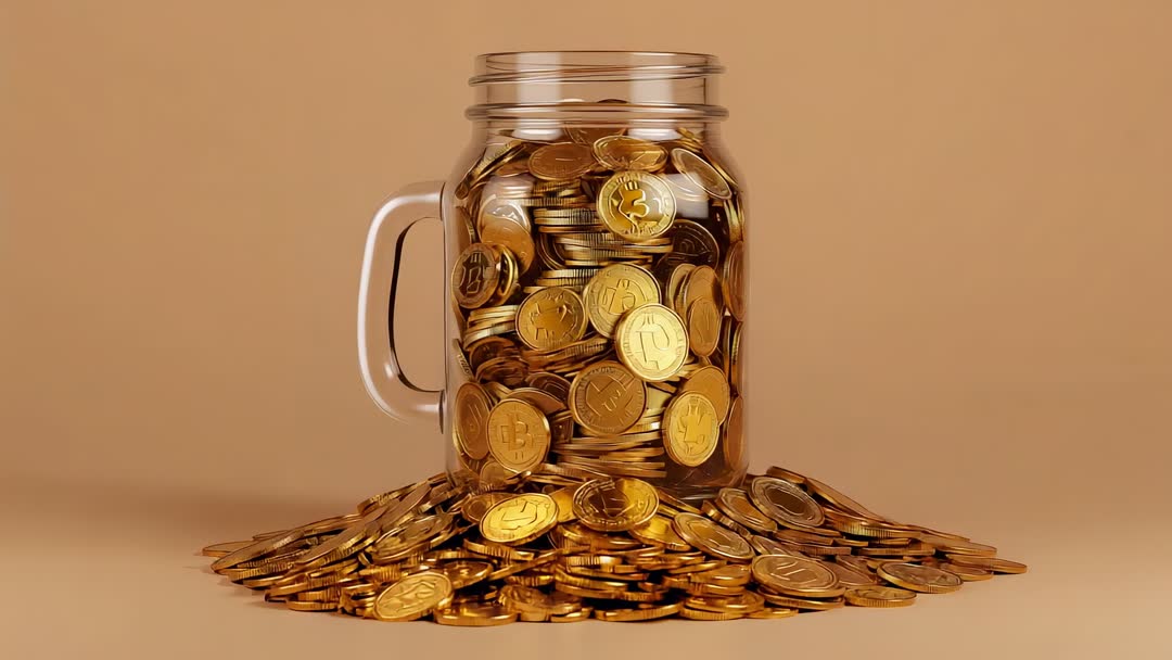 AI Generated Image. Showing mason jar overflowing with gleaming gold cryptocurrency coins spilling onto beige surface, bright highlights on glass and metal creating premium look. Featuring bitcoin-style coin faces and dense coin pile spilling around jar handle for dynamic composition. Perfect for fintech marketing, crypto savings campaigns, investment platform promos, financial blog headers, social media ads, presentation slides, website hero banners. Pairing with bold headline about savings, wealth building, digital currency adoption. Using editing techniques such as tight crop for product ad, motion blur for animated intro, selective desaturation to emphasize gold tones. Licensing note: AI-generated content included, disclose when required by platform policies.