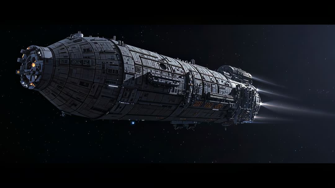 AI Generated Image. Video showing massive cylindrical starship approaching through starfield while rear engines firing, casting glow across textured paneling and revealing attached satellite and exterior modules. Camera performing slow tracking shot along hull with cinematic depth of field and high-contrast rim lighting, emphasizing surface detail and structural geometry. Ideal for use in sci-fi trailers, technology presentations, website hero banners, ebook covers, film pitch decks, motion graphics, and concept art portfolios. Useful for visualizing interstellar transport, long-range missions, spacecraft design studies, and propulsion demonstrations. Suggested postproduction: add subtle lens flares, warm engine bloom, ambient space dust layers, and low-frequency rumbles for immersive sound design. Suitable as AI-generated concept for pitch visuals, background footage for VFX sequences, or hero clip for futuristic branding.