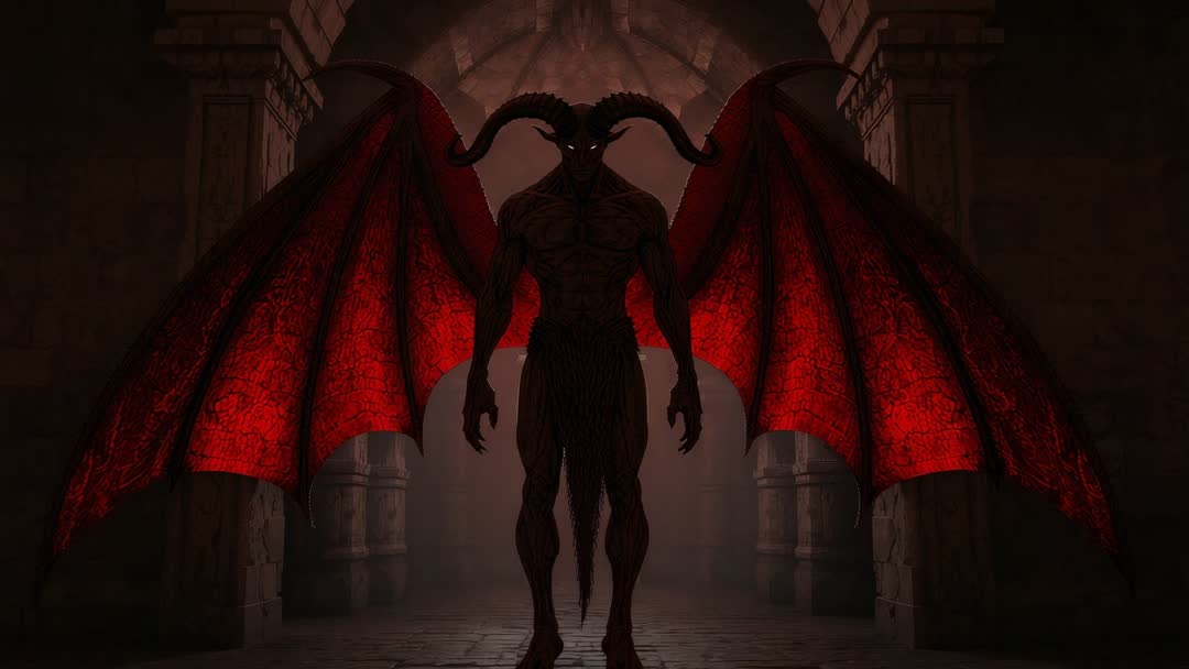 - Massive Horned Demon Standing in Mysterious Gothic Hall