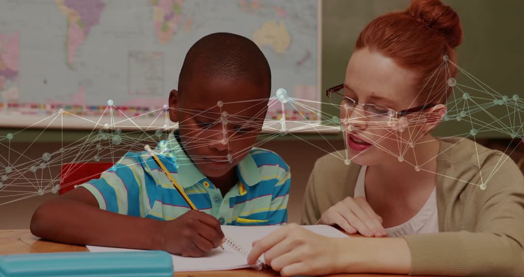 Young student working in classroom with teacher guidance, writing in notebook with tech overlays representing global connectivity. Useful for educational tools, technology in education adverts, and school brochures focused on enhancing learning experiences.