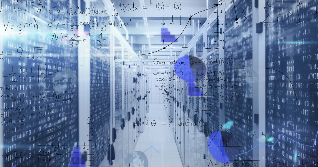 An imaginative blend of mathematical equations over a modern server room symbolizes the convergence of science and technology in data management and processing. Ideal for technology-focused communications, network solution promotions, and educational content on IT infrastructure.
