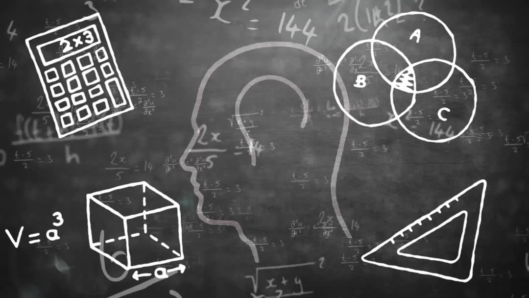 Chalkboard-themed representation combining digital technology and education. Various mathematical icons like a calculator, cube, and triangle reflect analytical and problem-solving skills embodied by a profile silhouette head. Great for academic illustrations, educational blog posts, and STEM program advertisements.