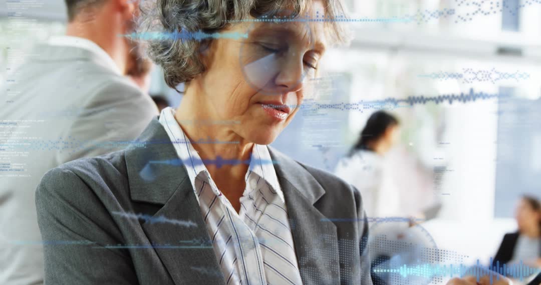 Scene showing mature executive tapping tablet while translucent data overlays and waveform graphics float across screen, blurred colleagues moving in background. Close-up capturing focused expression, confident body language, professional attire, interactive touchscreen gesture. Video working well for corporate branding, SaaS demos, analytics platform promotions, leadership training, investor presentations, website hero banners. Using for social media ads, LinkedIn posts, annual report videos, office culture reels, and pitch deck backgrounds. Color palette offering neutral corporate tones and soft blue data accents, enabling easy text overlay and branding adaptation.