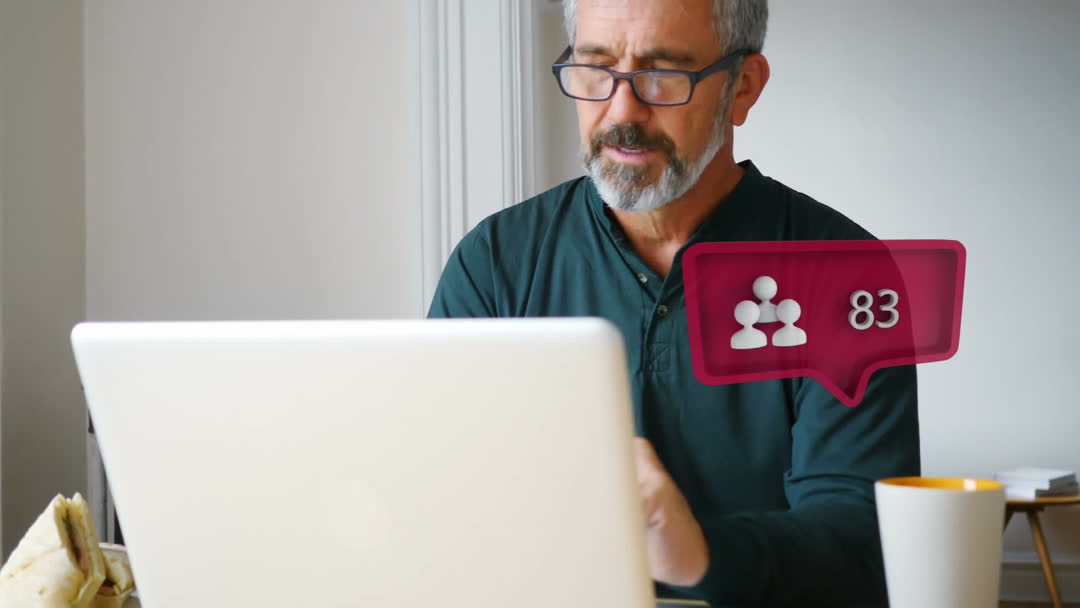 This scene shows a mature man focused on a laptop with a digital notification symbol indicating increasing engagement on social media. This type of video can be effectively used for illustrating digital communication trends, social networking strategies, digital literacy resources for older adults, or marketing technology aimed at mature audiences.