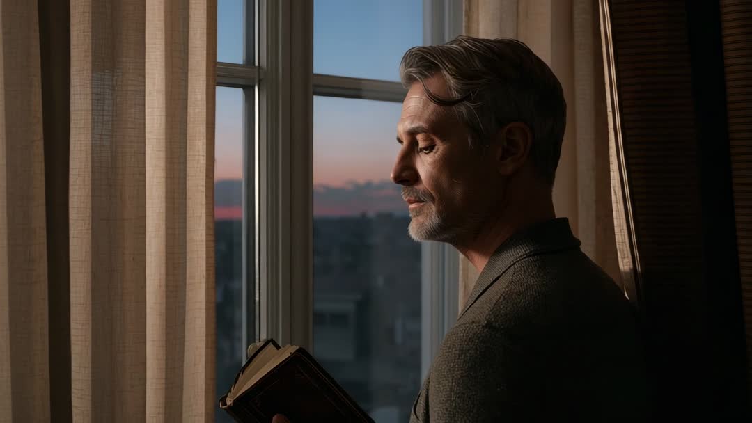 - Mature Man Holding Book by Window Reading and Watching Urban Sunset at Dusk, Cinematic Contemplation
