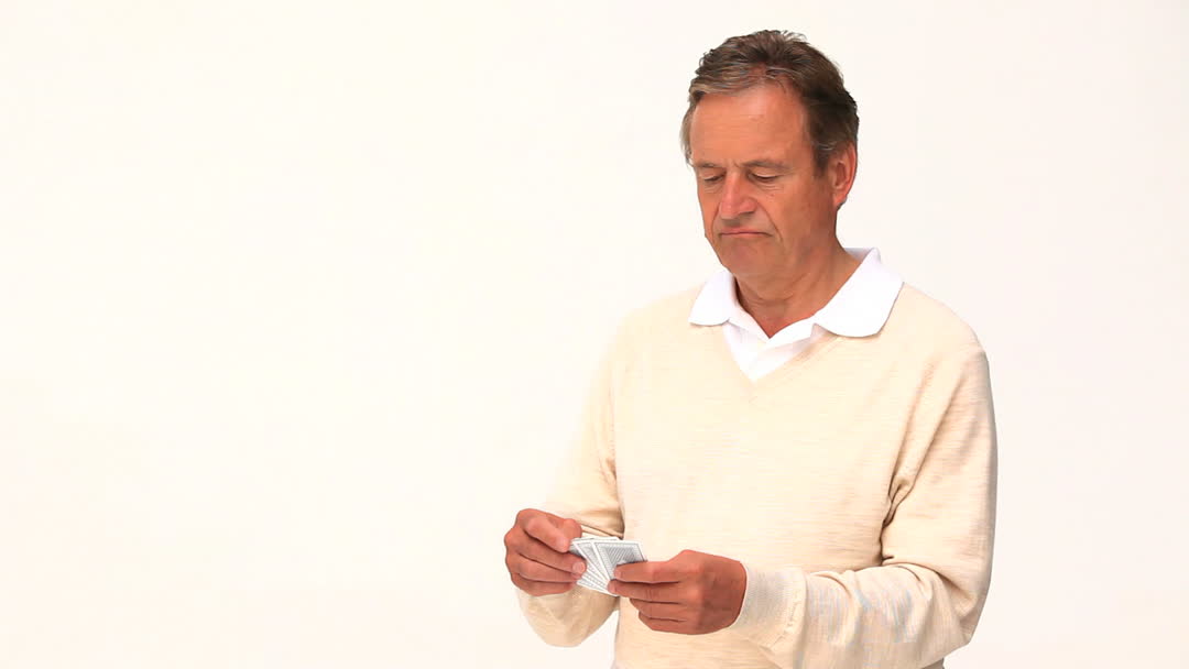 Mature man in casual clothes playing with cards against a plain white backdrop, offering a focus on individual leisure or focus on strategic thinking. This video can be used in designs related to leisure activities for seniors, card games, or leisure pursuits and mental stimulation in elderly individuals. Suitable for content centered around lifestyle, psychology for seniors, and mental skill games.