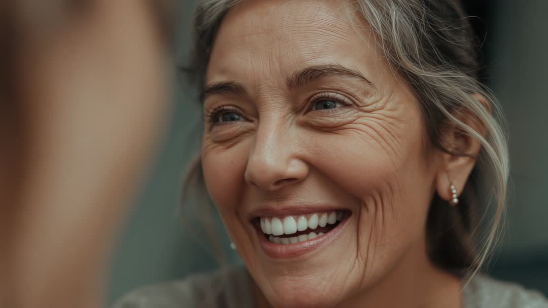 AI Generated Image. Close-up video clip showing mature woman laughing and smiling during warm home conversation. Featuring natural wrinkles, bright teeth, gray hair, and hoop earrings. Conveying genuine joy, warmth, and friendly connection. Use for dental and oral care campaigns, senior lifestyle and wellness content, retirement community promotions, healthcare advertising, family and relationship blogs, social media reels, editorial stories about aging gracefully, and stock b-roll for commercial spots. Edit suggestions: trim to 5–10 second loopable clips for social platforms; add soft instrumental music and warm color grade; crop for square and vertical formats. Licensing note: model release recommended for commercial use.
