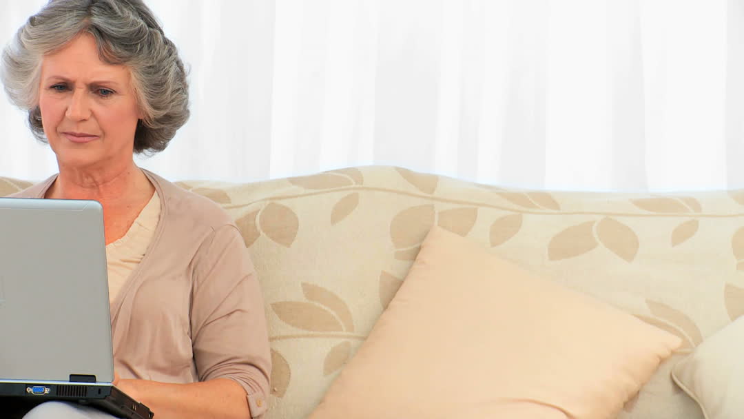 Mature Woman Using Laptop on Comfortable Sofa for Remote Work Video