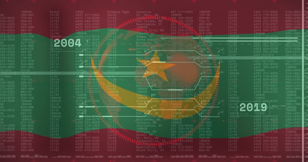 This stock photo combines the traditional videory of the Mauritania flag with modern digital effects, showcasing data analytics concepts by integrating scrolling code and futuristic graphical interfaces. It can be used in contexts involving discussions about technological innovations in Mauritania, presentations on global data analytics trends, or visualizations involving country-specific technologies.