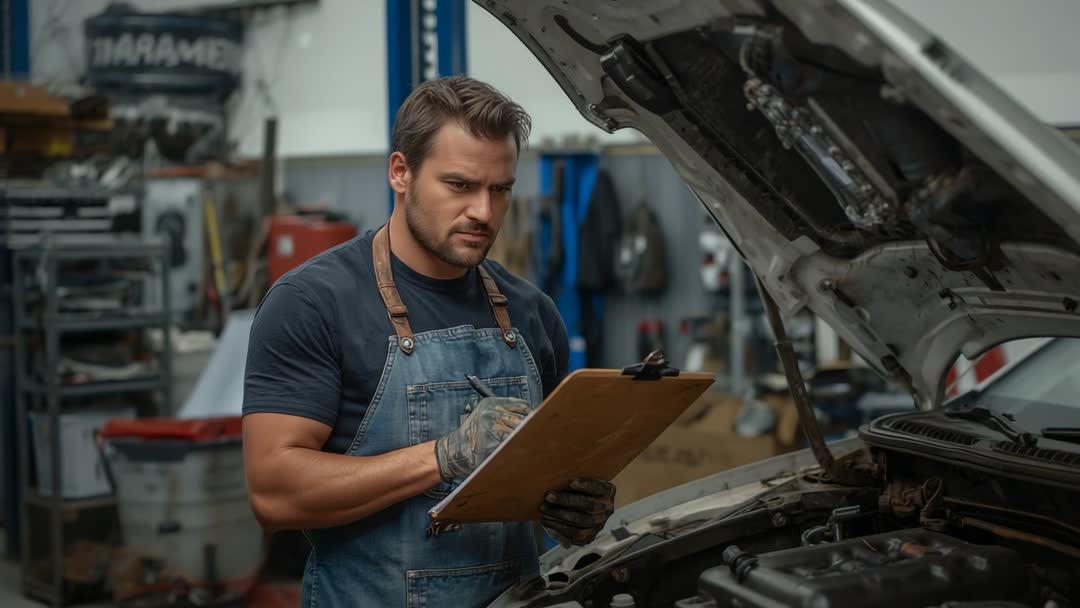 - Mechanic Conducting Car Inspection with Checklist in Auto Workshop