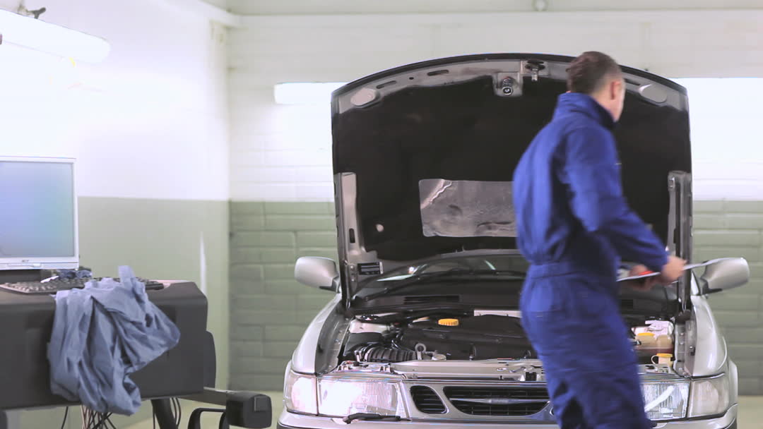- Mechanic Inspecting Car Engine in Workshop Garage