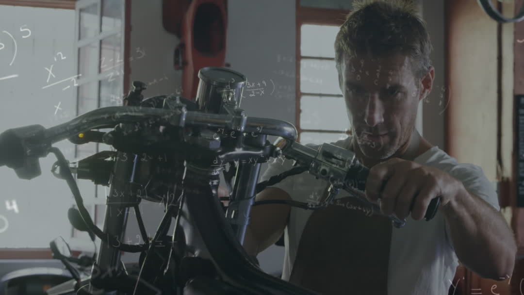 This scene features a Caucasian male mechanic intently repairing a motorcycle while numerous mathematical equations appear animated over the scene. Ideal for illustrating themes of innovation, engineering, mechanical problem solving, or the intersection of technology and manual work. Useful for educational content, business innovations, or interfaces that integrate technical precision in mechanics.