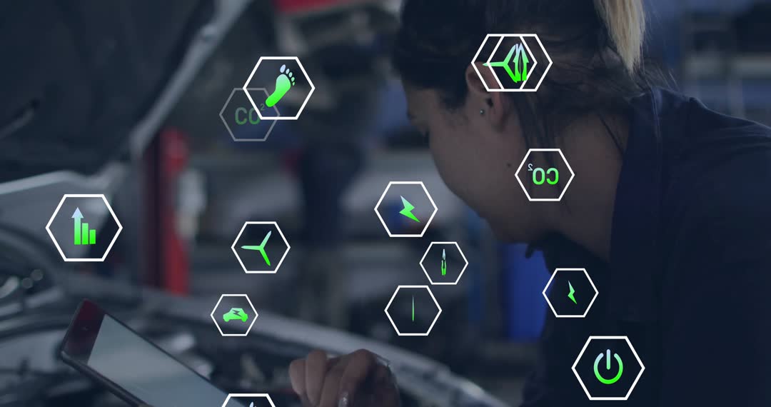 A female mechanic interacts with eco-friendly data using a tablet beside an engine bay, surrounded by floating green technology icons. This videory emphasizes the integration of modern technology in the automotive industry aimed at promoting eco-sustainability and efficient diagnostics. Ideal for use in articles or presentations focusing on automotive innovation, industrial advancements, and green technology solutions.