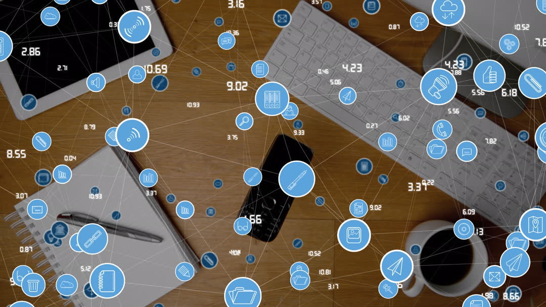 Media Icons Overlay on Office Workspace for Networking Concept Video