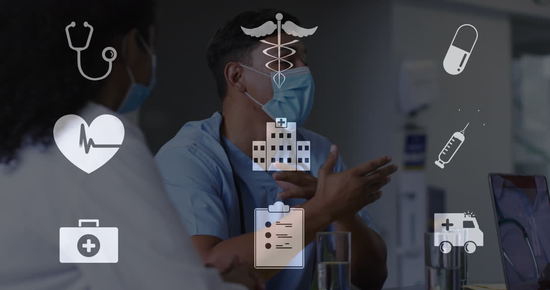 Health professional in discussion with patient, wearing face masks for safety to prevent infection. Various medical icons overlayed, emphasizing modern healthcare and digital health interface advances. Useful for themes on healthcare technology, doctor-patient interaction, and pandemic safety protocols.