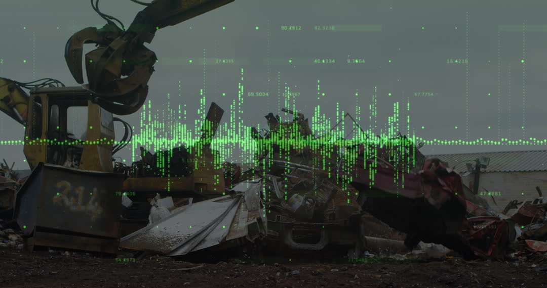 This video features an overlay of animated medical data streams in conjunction with recycling machinery in the background. It conveys a juxtaposition of technology and environmental consciousness, emphasizing the intersection of health and sustainability. This visual is ideal for conveying themes of eco-friendly technology in medical or environmental articles, presentations, and campaigns about technological advancements in recycling and sustainability.
