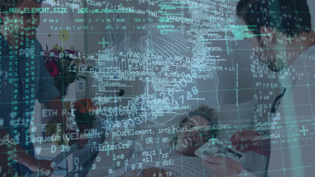 Caucasian doctors communicate with a female patient, symbolizing the integration of technology in modern healthcare. Data and code are visible as an overlay, illustrating advances in medical data management. Useful for articles on digital health innovations, healthcare IT solutions, and the impact of technology in medical treatment.