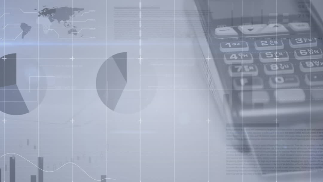Digital animation depicts a fusion of COVID-19 virus cells and overlapping statistical graphics, including charts and a map. Calculator and processing symbols emphasize technological approaches to data management and pandemic tracking. Suitable for illustrating global health reports, business impact of COVID-19, or presentations on data technology solutions during pandemics.