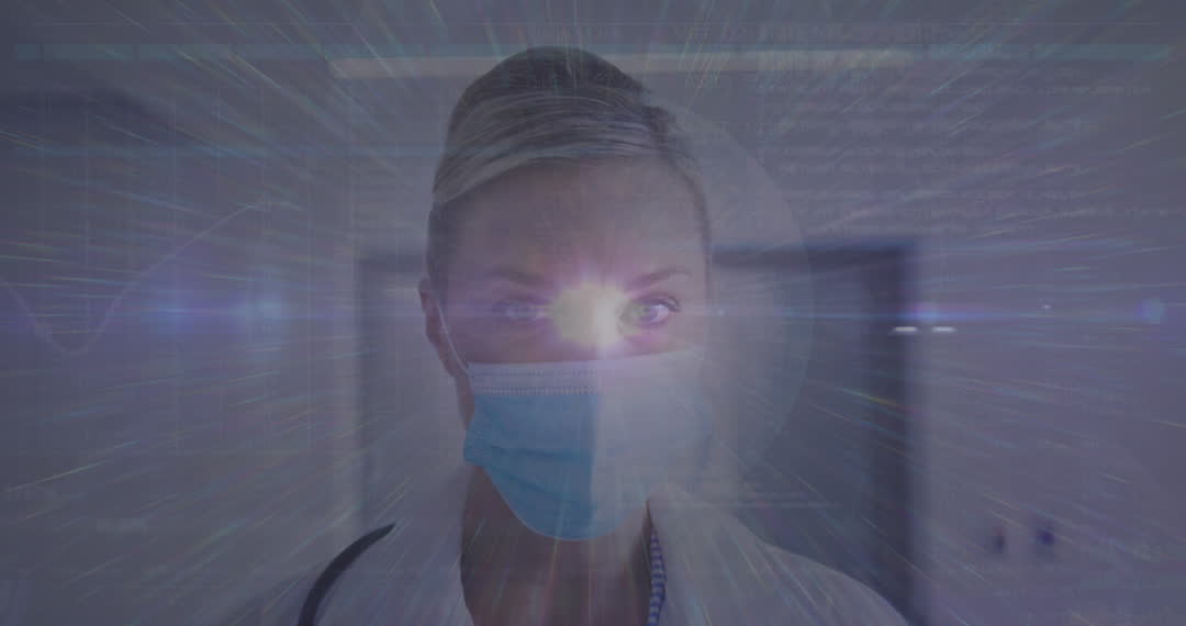 Visual of a doctor in a face mask with digital data overlay. Showcasing the fusion of medicine and technology, particularly relevant during the COVID-19 pandemic. Useful in contexts highlighting advancements in healthcare, pandemic response, medical research, and technology integration.