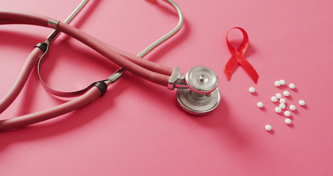 This video features a stethoscope alongside a red ribbon and small white pills arranged on a pink background. The red ribbon represents health awareness, emphasizing causes such as breast cancer awareness. Ideal for use in healthcare promotions, educational materials, or campaigns focused on healthcare and disease prevention initiatives.
