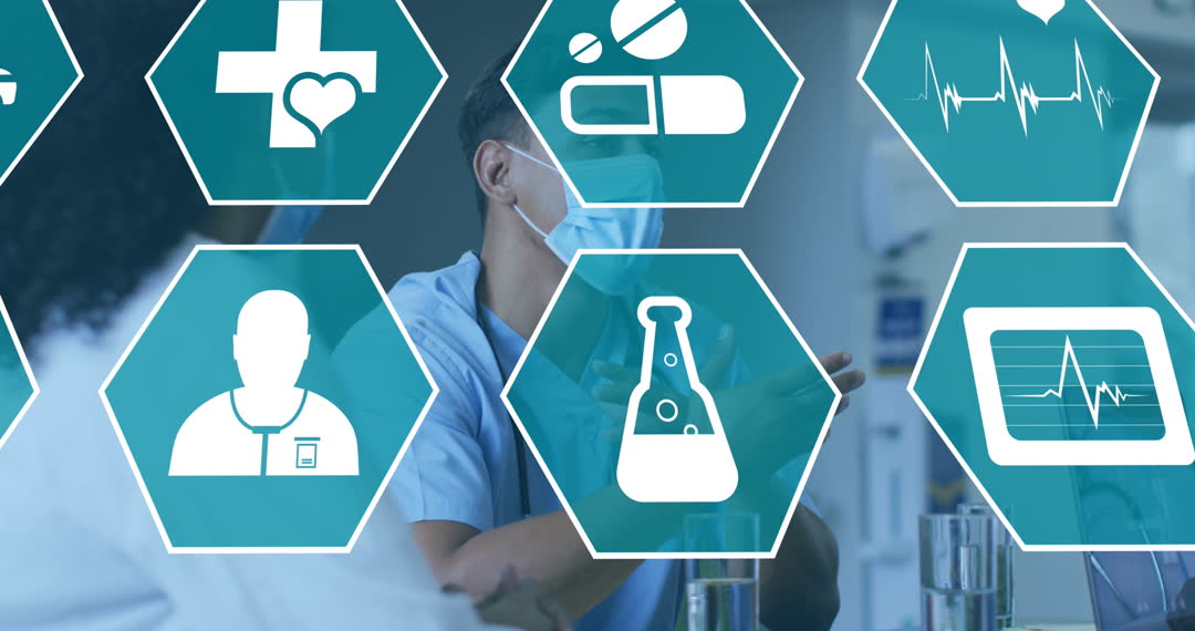 Medical Icons Overlaying Doctors Discussing in Masks Video
