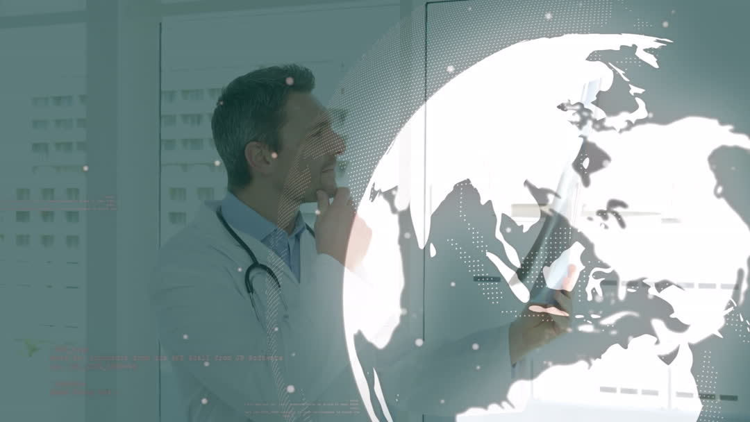 A Caucasian male doctor examines an x-ray report alongside a digitally overlaid globe, symbolizing the convergence of technology and healthcare. The video captures the essence of modern medical practices with its futuristic digital interface. This could be used in promotional materials or articles discussing medical innovations, healthcare technology advancements, or global health initiatives.