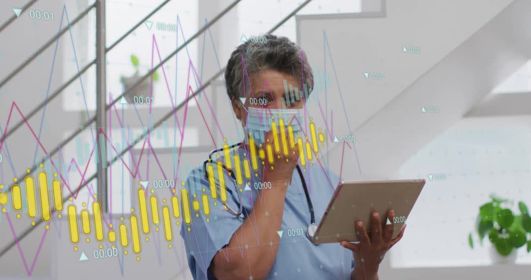 Medical professional wearing a face mask is observing and analyzing dynamic health charts displayed over a digital interface on a tablet. This visual represents the integration of modern technology in healthcare, showing clinical environments where data analysis and health technology are necessary. Suitable for illustrating advances in clinical practices, the importance of digital tools in modern medicine, and revolutionary healthcare passions.