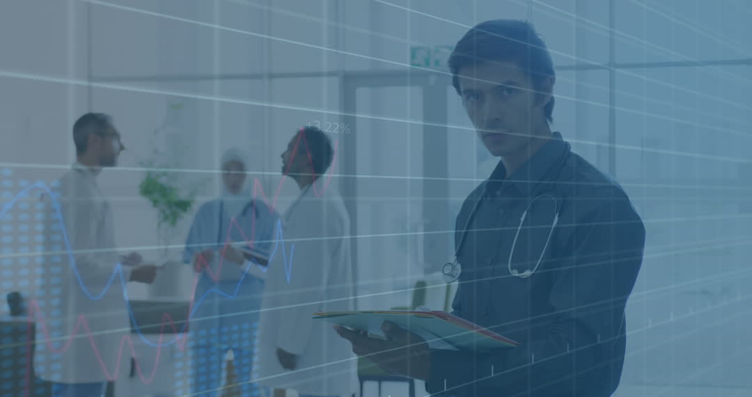 Image features a thoughtful healthcare professional with financial graphs overlay. The combination suggests a merging of medical practice with economic analysis, indicating the role of financial acumen within the healthcare industry. Useful for illustrating concepts such as health economics, medical business strategies, and the impact of financial decisions on medical services.