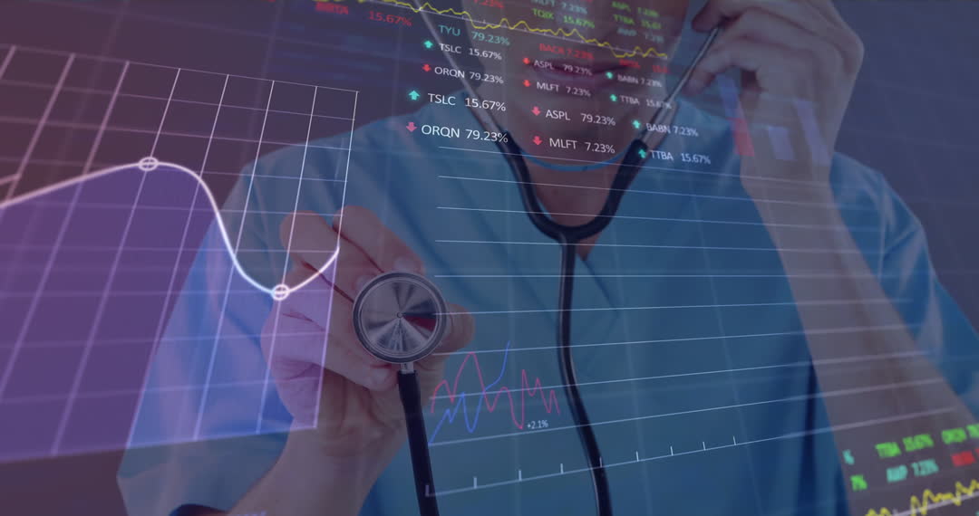- Medical Professional Analyzing Financial Data with Stethoscope Overlay
