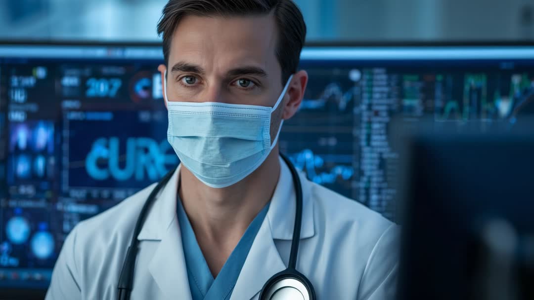AI Generated Image. Clip depicts a male doctor in a control room environment, equipped with modern technological interfaces. Wearing a surgical mask and stethoscope, he monitors intricate data on screens, suggesting advanced medical and diagnostic analysis. This could illustrate themes of future healthcare, data-driven diagnostics, and the role of AI in modern medicine. Useful for educational and promotional content focusing on technological advancements in healthcare and professional settings in medical fields.
