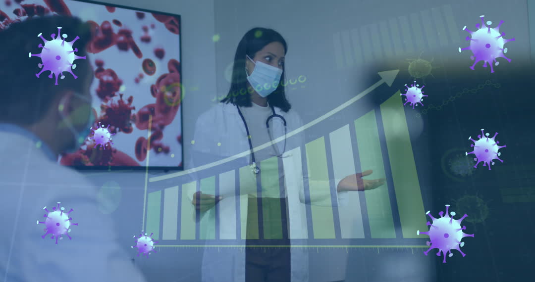 Visual representation shows a medical professional explaining COVID-19 data, with virus cells and graphs overlayed. Useful for articles or presentations on healthcare challenges, pandemics, and technological integration in medicine. Suitable for educational content explaining COVID-19 trends, healthcare strategies, or the intersection of technology and biology.