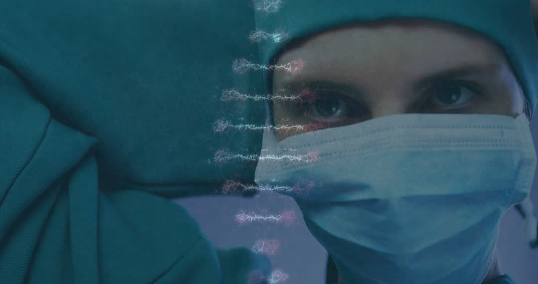 Medical Professional Wearing Scrubs and Mask with DNA Strand Overlay Video