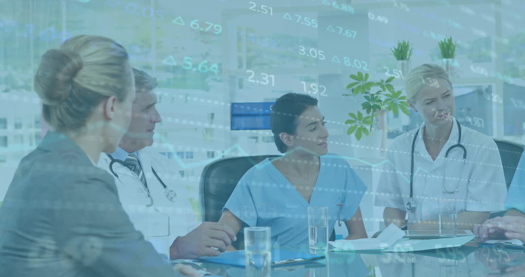 Healthcare professionals in official attire are gathering in a modern hospital setting, presumably discussing patient care strategies or administrative reforms. Digital overlays of rising and falling financial figures suggest themes of hospital management, medical business analytics, or the incorporation of technology into healthcare procedures. Suitable for conveying themes of modern medicine integrating with tech solutions or illustrating discussions on health economics.