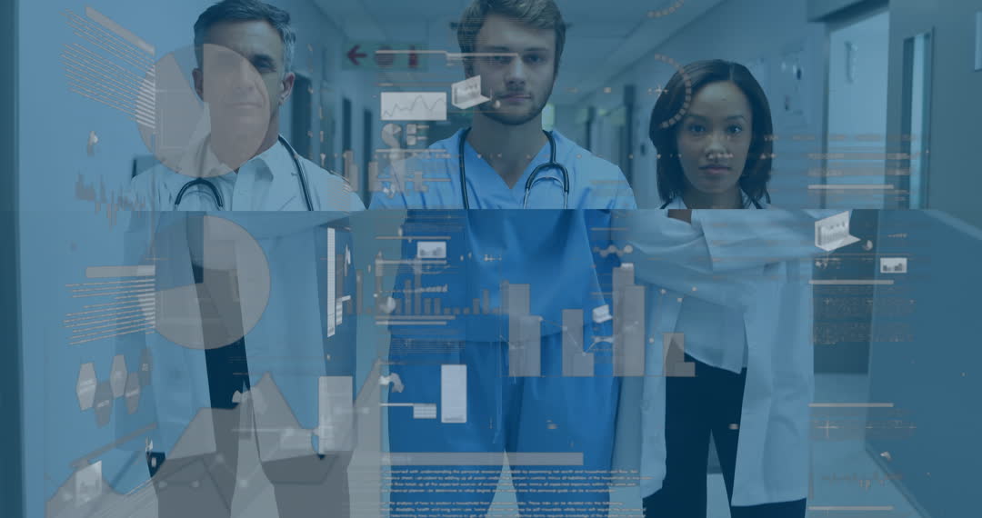 A diverse group of medical professionals is standing confidently in a hospital corridor, overlaid with animated financial data and graphs. This visual represents the intersection of healthcare and economic analysis, highlighting the importance of data-driven decisions in medical settings. Ideal for use in healthcare industry presentations, financial reports in medicine, and discussions about technological advancements in healthcare.