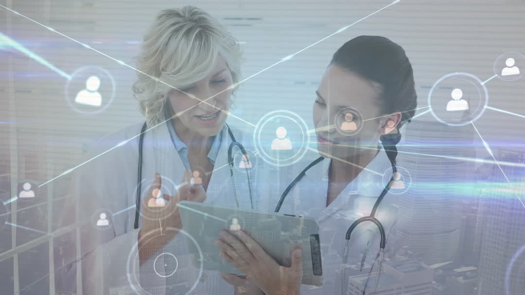 Two medical professionals are discussing information on a tablet, symbolizing collaboration and communication in healthcare. Overlay of digital network videory suggests connection and modern technological advancements in a medical setting. Useful for illustrating concepts of healthcare innovation, telemedicine, digital networking, and teamwork in the medical field.