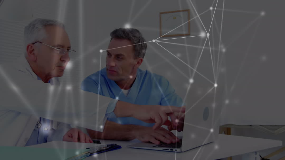 Features medical professionals analyzing network connections on a laptop, highlighting digital innovation in healthcare. Useful for illustrating modern medicine, technological integration, and healthcare advancements. Ideal for magazines, medical publications, or educational materials focusing on digital health solutions.
