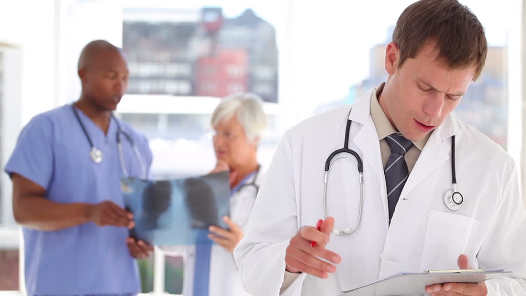 Medical professionals, including a focused doctor taking notes on a clipboard and two colleagues reviewing an X-ray, coordinate their efforts in a clinical setting. This could be useful for medical-themed presentations, healthcare articles, or hospital related content.