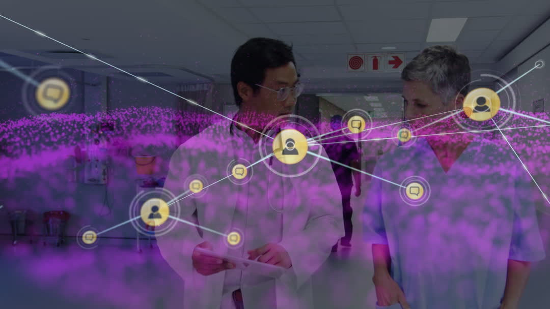 Medical professionals engage in a conversation while digital network overlays highlight global connectivity and innovation within healthcare. This video exemplifies the integration of technology with traditional medical practices, great for illustrations about modern healthcare, collaborative medical solutions, or digital innovation in the medical field.