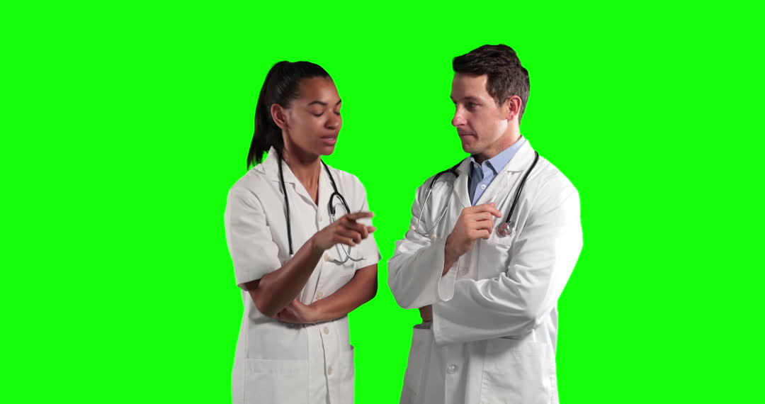 Two doctors are engaged in conversation in front of a green screen. This can be used for medical training resources, promotional materials in healthcare, and instructional videos demonstrating technological interactions.