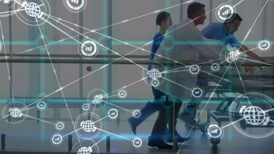 Medical professionals are seen running in a hospital corridor, symbolizing urgency and emergency care. Overlaid on the scene are digital networking icons and connections, indicating the integration of technology in the healthcare environment. This visual is suitable for illustrating the intersection of healthcare and digital innovation in medical facilities. Use in articles about health tech advancements, hospital efficiency with technology, or emergency services innovation. Ideal for platforms discussing modern medicine, tech improvement in patient care, or global healthcare networks.
