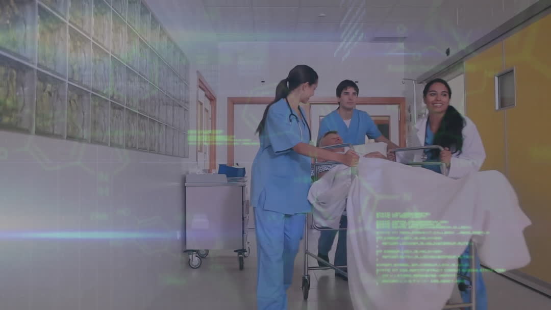 Depicts a diverse team of medical professionals transporting an emergency patient on a stretcher through a hospital corridor, with a digital data displaying overlay. This conveys modern healthcare, teamwork, and efficiency in a dynamic hospital environment. Useful for illustrating contemporary medical technology advancements, healthcare teamwork, and emergency medical scenarios in presentations, articles, or websites related to health and medicine industries.