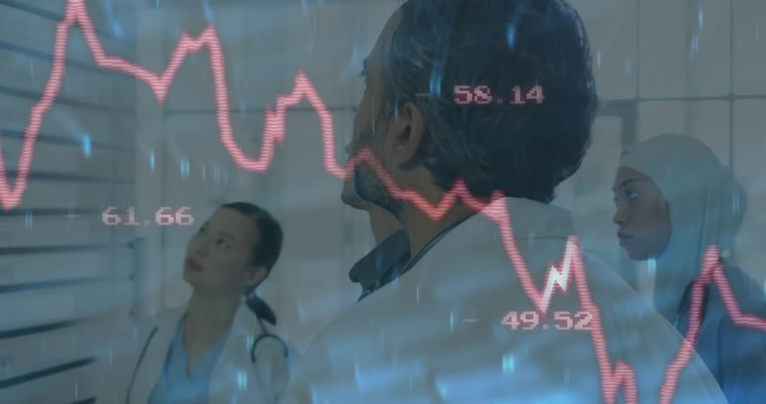 Team of medical professionals using digital technology to interpret and analyze data. Overlay graph represents real-time data interaction, highlighting innovation and accuracy in healthcare diagnostics. Useful for articles on modern medicine, technological advancements in healthcare, teamwork dynamics, and innovative diagnostic methods.