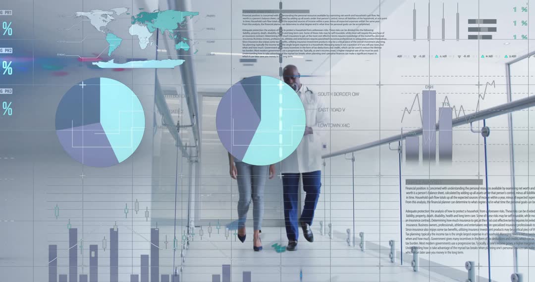Two healthcare professionals, a doctor and a nurse, are walking through a hospital corridor while engaging with floating digital charts displaying patient data. This emphasizes technological innovation in medical data analysis and diagnostics. Use this video in materials highlighting advancements in healthcare technology, teamwork among medical staff, or innovative diagnostic solutions in hospital settings.