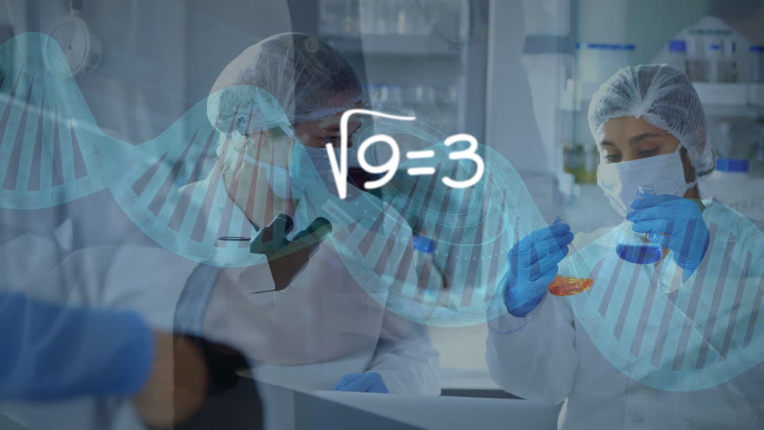 Depicts a group of doctors engaged in research clothed in protective attire. A symbolic DNA strand and mathematical equation overlay suggest a focus on genetic research and quantitative analysis. Ideal for illustrating advancements in medical technology, collaboration among diverse healthcare professionals, or medical education and training content in the fields of biotechnology and medical innovation.
