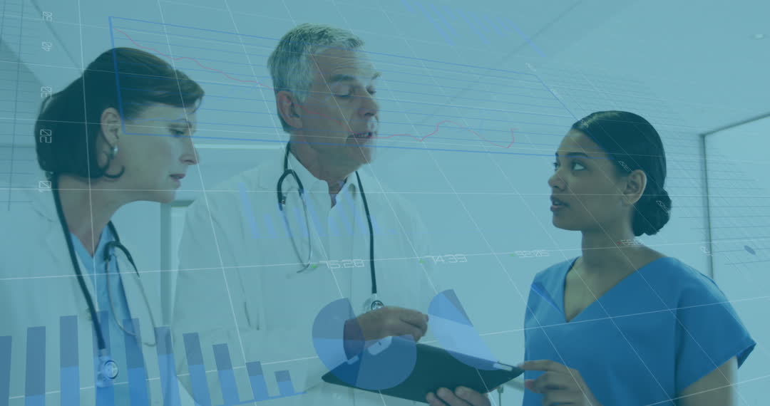 A group of doctors discussing healthcare data while digital charts overlay the scene within a hospital setting. Useful for representing themes like medical innovation, data-driven healthcare processes, teamwork among healthcare professionals, and modern medical advancements.