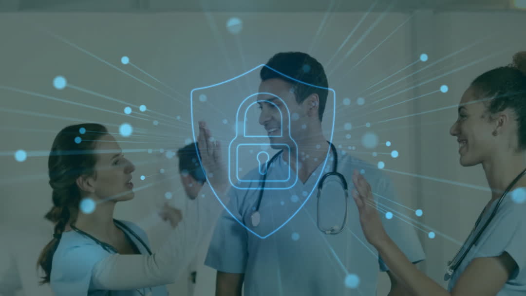 Group of diverse doctors high fiving in celebration, with a digital lock icon symbolizing online privacy and cybersecurity in healthcare. Ideal for use in presentations or articles related to medical cybersecurity, data protection in healthcare, or illustrating teamwork in a hospital setting.