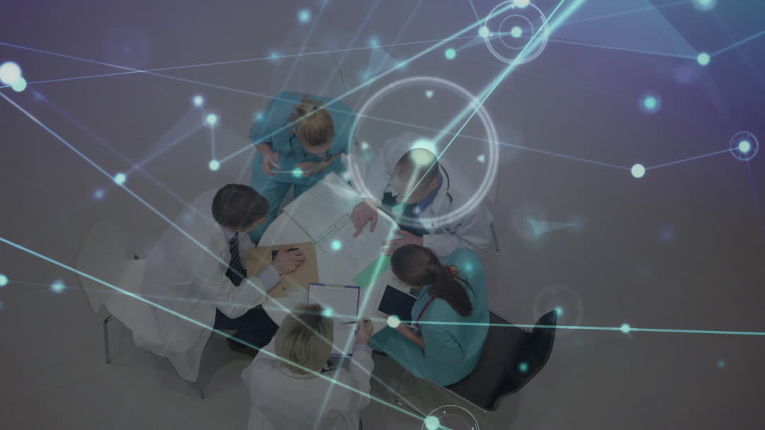 Diverse group of doctors collaborating, with digital network overlay symbolizing healthcare technology. Ideal for content on medical teamwork, innovative healthcare solutions, and digital transformation in the healthcare industry. Suitable for illustrating futuristic advancements in medical settings and promoting technology-enabled health initiatives.
